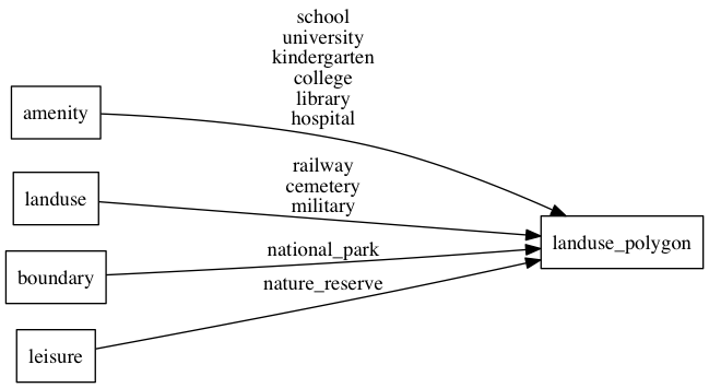 • class: More generalized groups of either park, school, hospital, railway, cemetery, military, residential. Use this to assign general for landuse.